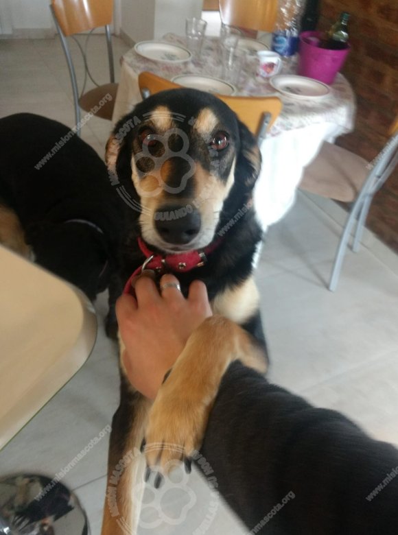Colmillo inferior izquierdo partido. Negra con cejas y patas marrones.
