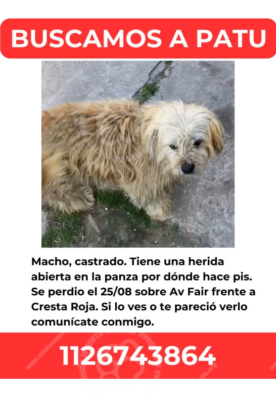 Soy Patu (macho) me perdí el domingo 25 agosto 2024 (hace 1 año) cerca de San Ignacio (B1805), Buenos Aires.