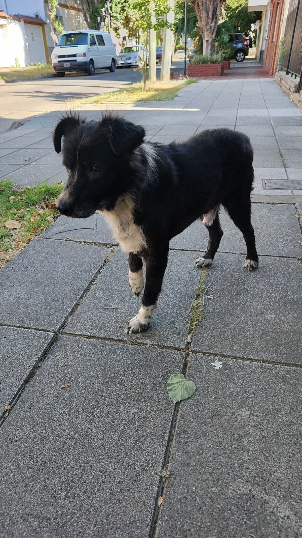 Perro de tamaño mediano con pelaje negro y una gran mancha blanca en el pecho que sube hacia el cuello. Tiene las 'medias' de las patas blancas con motas negras. Se nota que es un adulto por el gris en su hocico. Sus ojos son de un marrón profundo y sus orejas son caídas y tienen pelo largo. No se observa collar.