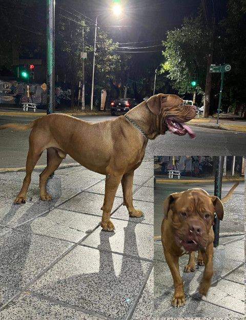 Perro de gran tamaño y contextura robusta, raza Dogo de Burdeos. Su pelaje es corto y de color leonado. Tiene una cabeza prominente con muchas arrugas faciales, hocico chato y orejas pequeñas caídas. Se lo ve de pie en la calle de noche, con una cadena metálica al cuello.