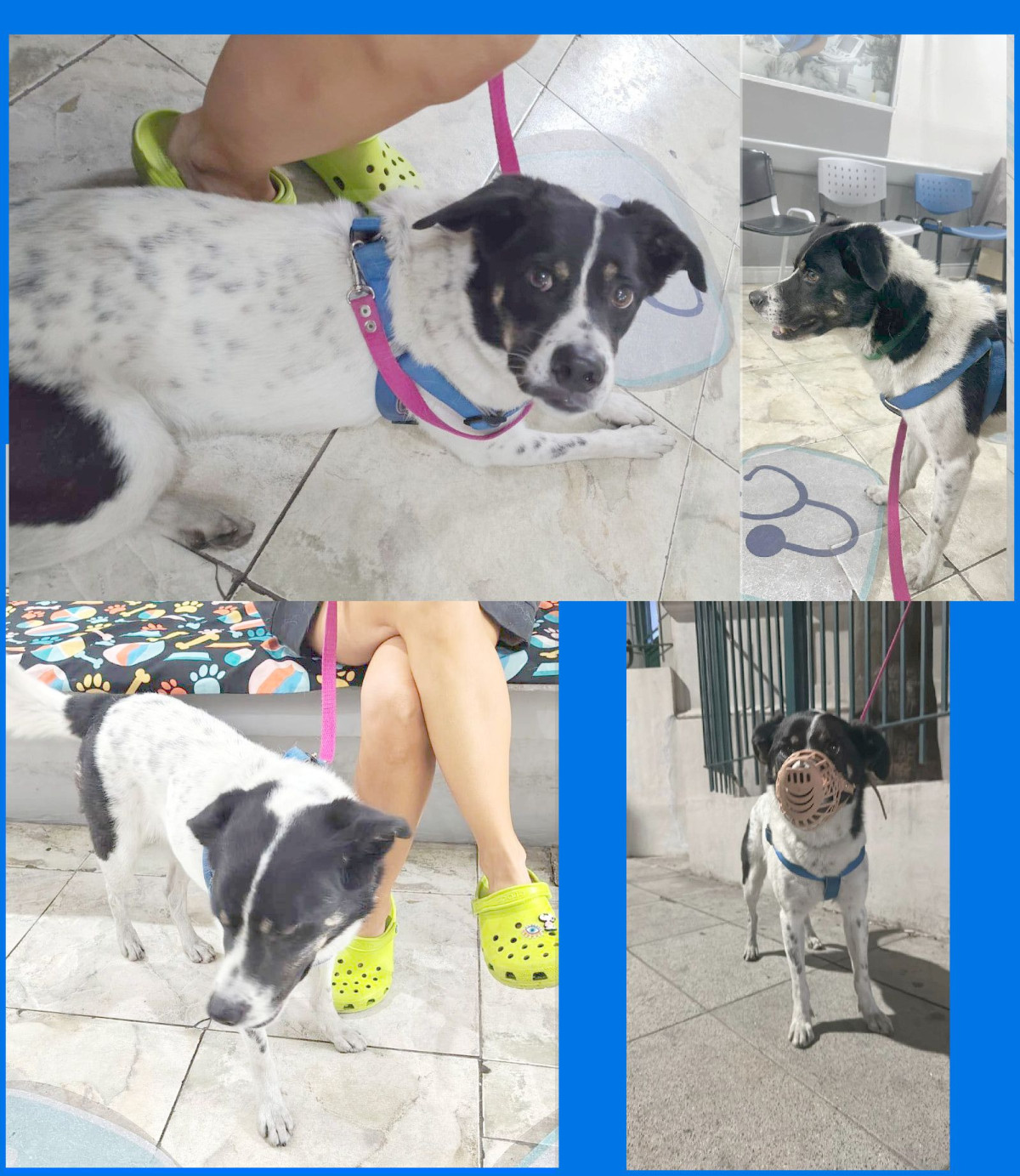 Perro mediano de pelo corto y liso. Su pelaje es blanco con motas negras distribuidas por el cuerpo y una mancha negra grande en la zona de la cadera. La cabeza es negra con una raya blanca en el hocico y marcas marrones sobre los ojos. Tiene orejas caídas y ojos marrones oscuros. Se lo ve con un pretal azul y una correa rosa; en una de las fotos lleva puesto un bozal de canasta plástico.