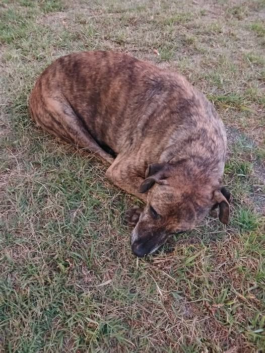 Es un perro mestizo de tamaño mediano con un llamativo pelaje atigrado en tonos marrones y negros. Se nota que es un animal mayor por las abundantes canas blancas alrededor de su hocico y ojos. Tiene orejas caídas y contextura física robusta. En las fotos se lo observa tranquilo, tanto recostado en el pasto como sentado frente a la cámara, y no lleva puesto ningún collar.