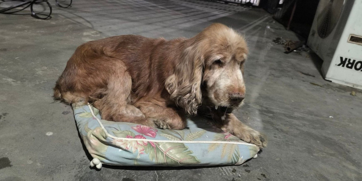 Es un perro de tamaño mediano, tipo Cocker Spaniel, con pelaje dorado y el hocico muy encanecido. Sus orejas son largas, caídas y con pelo ondulado. Se lo ve descansando sobre un almohadón celeste con flores en un ambiente con piso de cemento. Es un animal de edad avanzada, lo que se percibe en el color blanco de su rostro y su expresión tranquila.