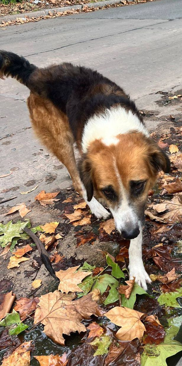 Perro mestizo mediano de pelaje tricolor. Tiene el lomo negro, los costados de color marrón claro y una marca blanca distintiva que rodea su cuello y baja por el pecho. El hocico es blanco con una línea que sube hacia la frente. Sus orejas son oscuras y caídas. Se lo ve caminando sobre la vereda con hojas secas, tiene una cola larga y peluda.