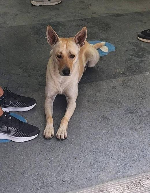 Perro de tamaño mediano con un pelaje corto y liso de color bayo claro. Se destacan sus orejas grandes, triangulares y bien erguidas que le dan un aspecto alerta. Tiene ojos marrones oscuros y una expresión tranquila. El pecho y la parte inferior de las patas presentan un tono crema más claro. Se encuentra descansando sobre un suelo gris con las patas delanteras extendidas y no se observa que lleve collar puesto.