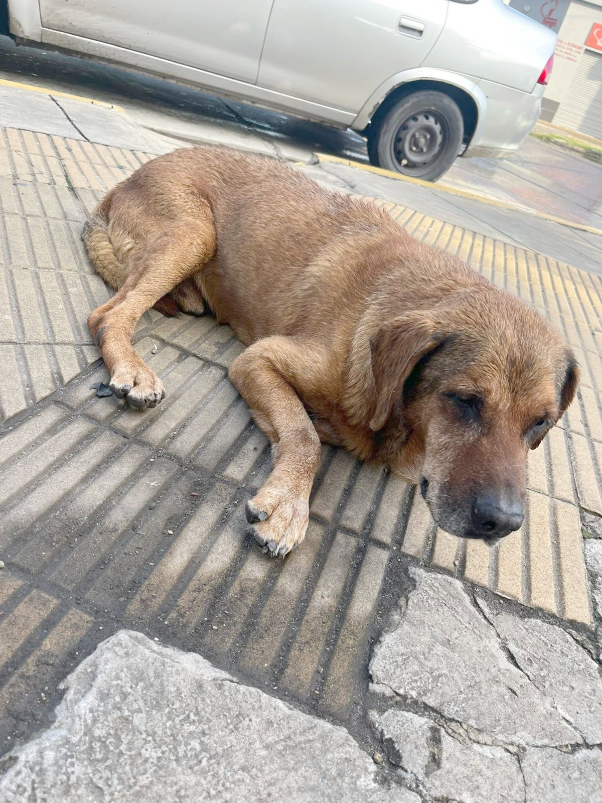 Es un perro de tamaño grande con pelaje corto de color marrón uniforme. Tiene el hocico ancho, orejas caídas y una contextura robusta. Se lo ve tranquilo, descansando sobre la vereda. No parece llevar collar ni identificación visible.