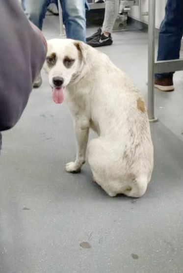 Un perro de tamaño mediano con un pelaje corto y suave de color blanco con manchas marrones. Tiene orejas caídas y ojos de color marrón oscuro. Su postura es relajada y muestra una lengua colgante. Parece estar en un ambiente interior, presumiblemente un medio de transporte.