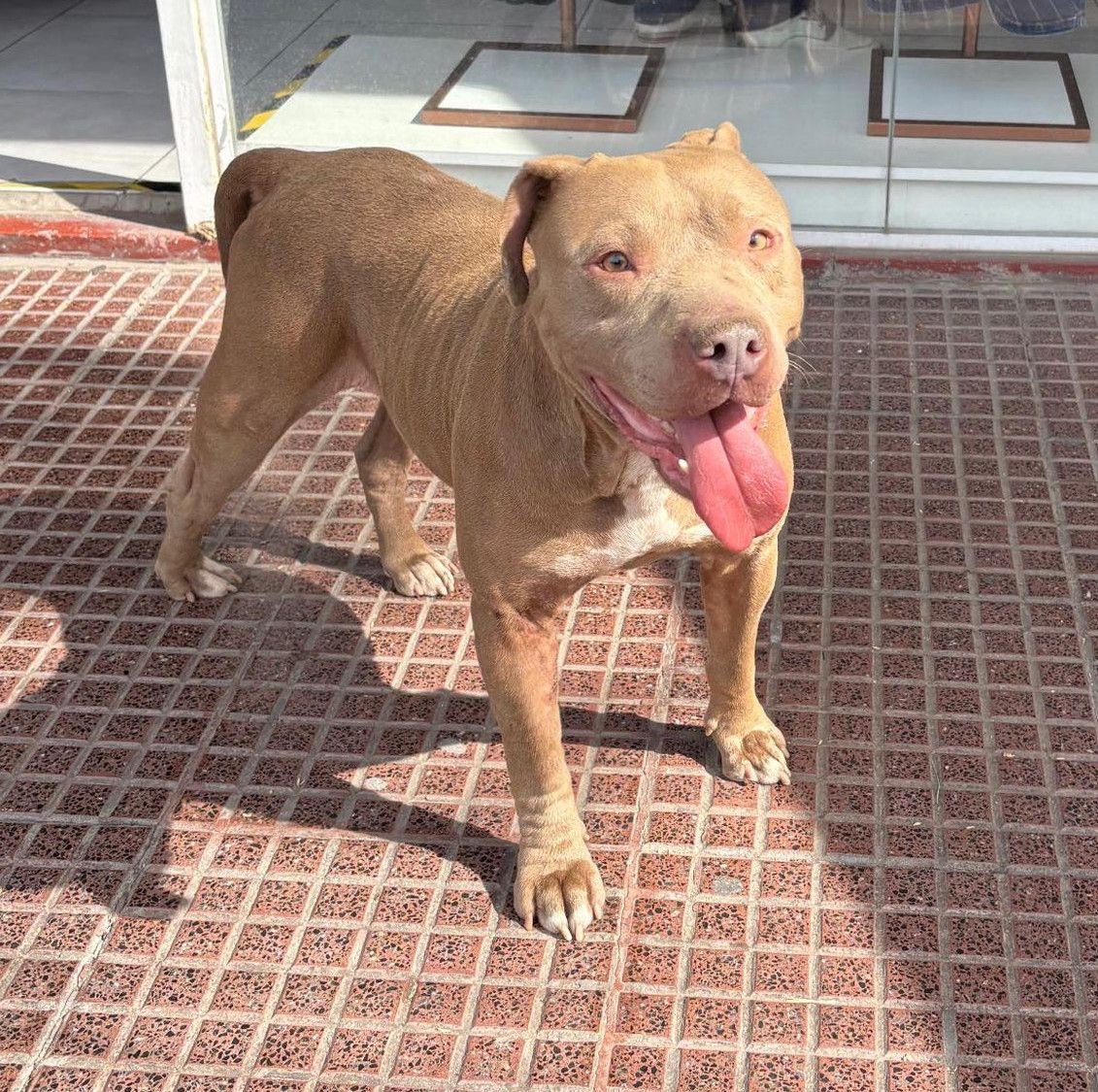 Es un perro robusto y fuerte, de tipo Pitbull, con un pelaje corto de color leonado parejo y una manchita blanca en el pecho. Tiene ojos claros color ámbar y una expresión amigable con la lengua afuera. Sus orejas son pequeñas y caen hacia adelante, y se nota que tiene una contextura atlética. Se encuentra parado sobre una vereda de baldosas rojas.