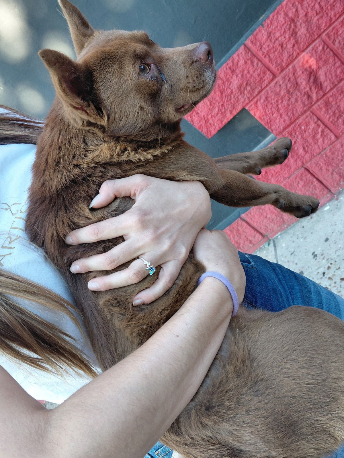 Es un perro de tamaño pequeño con un pelaje corto y tupido de un color marrón chocolate uniforme. Tiene orejas puntiagudas y bien paradas, y una nariz del mismo tono que su pelo. Sus ojos son de un color ámbar claro. En la foto se lo ve siendo alzado, lo que permite apreciar su tamaño compacto y su expresión atenta.