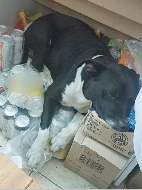Perro de tamaño mediano con pelaje corto y liso, mayormente negro con el pecho, el cuello y las patas delanteras de color blanco. Tiene una cabeza ancha característica de razas tipo pitbull. En la imagen se lo ve durmiendo tranquilamente sobre unas cajas de cartón y packs de bebidas, mostrando un poco de gris en su hocico debido a la edad.