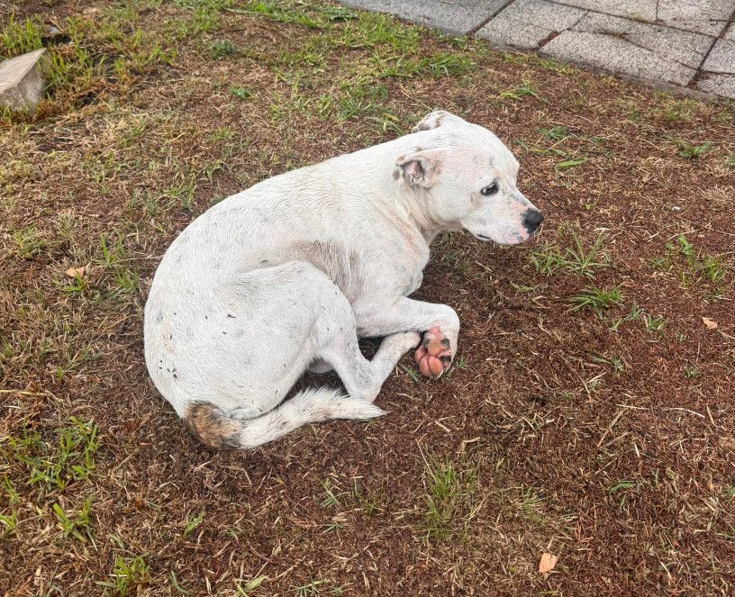 Perro de tamaño mediano con pelaje corto y mayormente blanco. Presenta una mancha marrón atigrada cerca de la base de la cola y pequeñas motas oscuras en el hocico. Tiene una contextura física robusta, cabeza ancha y orejas pequeñas y caídas. Se lo observa descansando acurrucado sobre el césped.