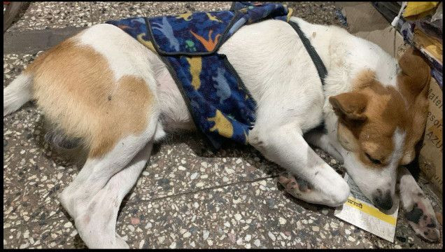 Es un perro de tamaño pequeño a mediano con el pelo corto y liso. Es mayormente blanco, con manchas de color marrón claro localizadas en su cabeza (cubriendo el ojo y la oreja derecha) y en la parte trasera de su lomo. Está descansando y lleva puesto un saquito de polar azul con estampas de dinosaurios en color amarillo y naranja. Sus orejas son pequeñas y caídas hacia adelante.