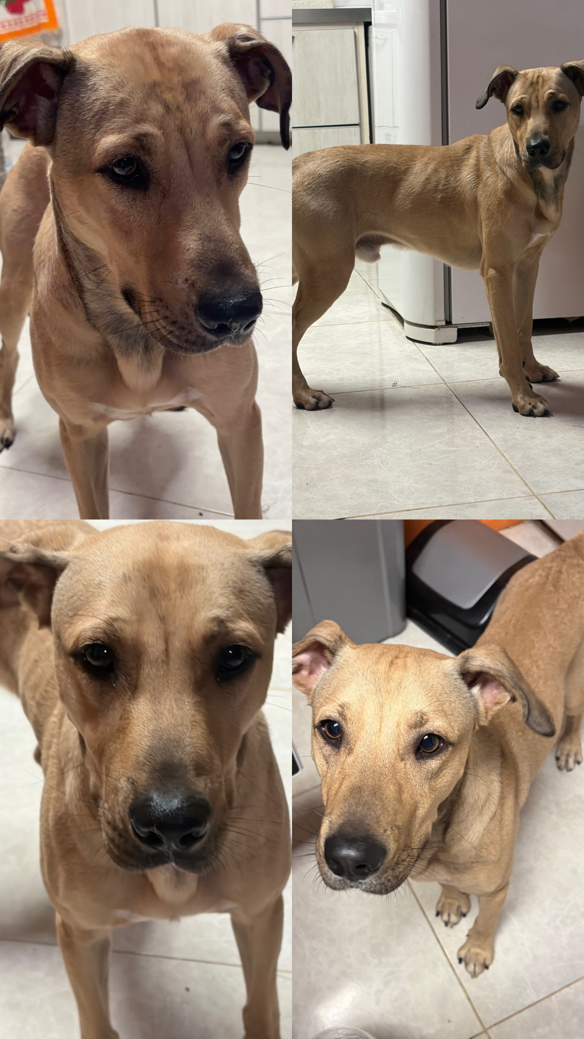 Es un perro de tamaño mediano con pelaje corto color leonado. Tiene una contextura física atlética, orejas que caen hacia adelante y un hocico oscuro con nariz negra. Se aprecia una pequeña mancha blanca en la zona del pecho. Sus ojos son de un tono marrón oscuro y se lo ve bien cuidado.