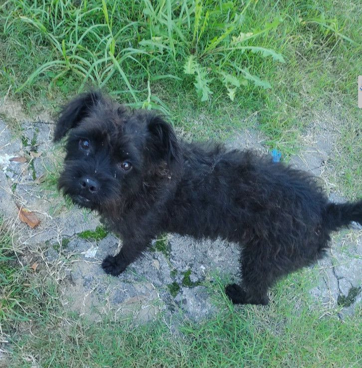 Es un cachorro pequeño de pelaje negro, ondulado y algo áspero. Tiene las orejas caídas y ojos oscuros muy expresivos. Su contextura es menuda y se lo ve con una postura curiosa sobre el pasto.