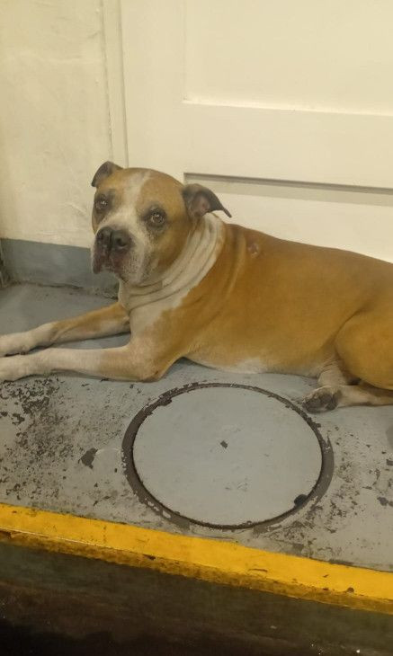 Perro de contextura robusta y musculosa, con pelaje corto de color marrón claro y manchas blancas en el pecho, cuello, cara y patas delanteras. Tiene una cabeza ancha, orejas semi-caídas y ojos oscuros con una expresión tranquila. Se lo ve descansando en el suelo.