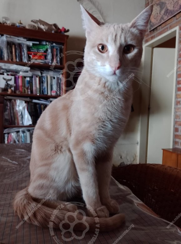 * PELAJE CORTO. * PELAJE TÉ CON LECHE (BEIGE - MARRON CLARO Y ALGO DE BLANCO) * MANCHAS TIPO MARMOLADOS (BIEN DISTINTIVAS EN SU LADO DERECHO) * COLA BIEN LARGA, GRUESA Y RAYADA * PATAS CORTAS EN RELACIÓN AL CUERPO * OJOS COLOR MIEL