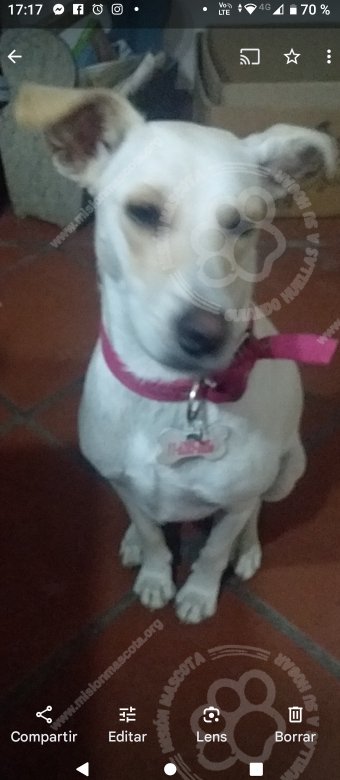 NO TIENE SU COLLAR se zafó de el por eso escapó Tiene manchas en su panza La patita derecha no apoya de vez en cuando Está castrada Tiene un diente de abajo tirado para atrás