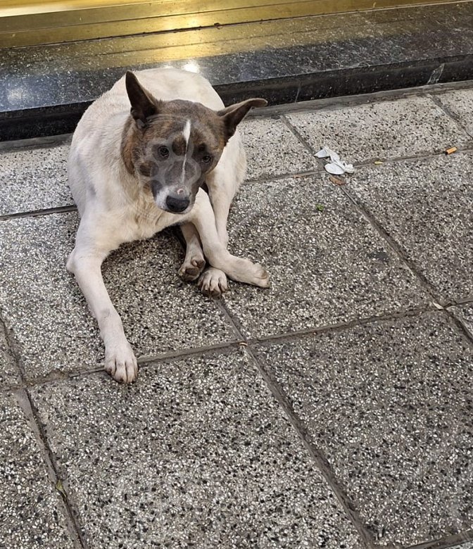 Es toda blanca con cabeza atigrada marron y negro. Esta junto a otro perrito macho, van cambiando de locación pero se van manteniendo juntos todo el tiempo.