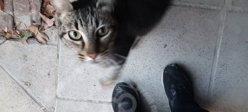 Gato marron rallado, muy mimoso y muy flaco. Pelaje suave y medio largo. Sin collar. Parece que hace tiempo no se alimenta.