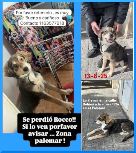 Rocco (macho) se perdió el martes 12 agosto 2025 (hace 3 meses) cerca de Cerca de Carlos Gardel (1684) ciudad de Palomar, Buenos Aires.